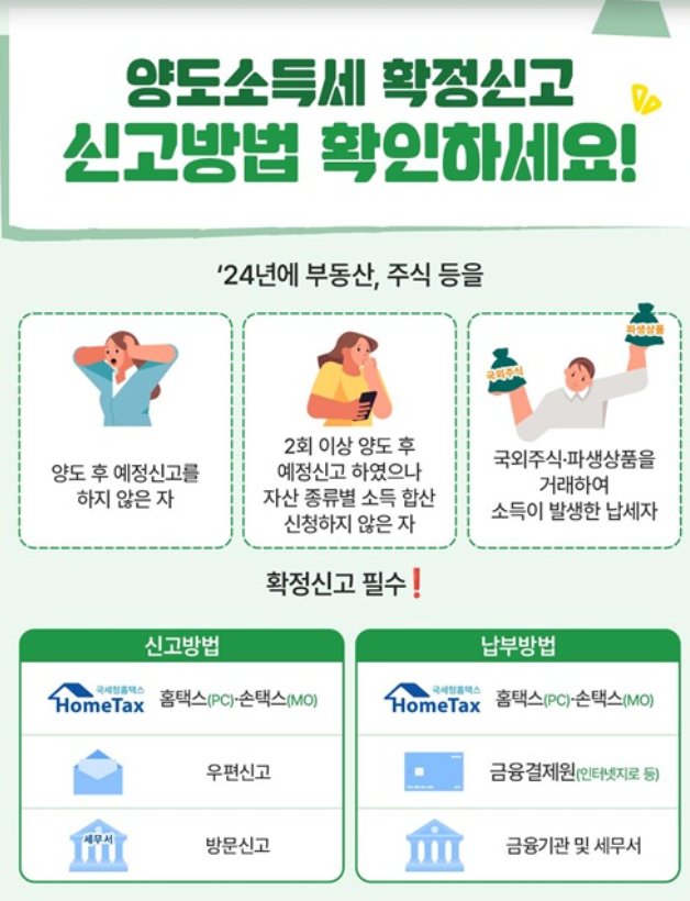 양도소득세 확정신고 대상자는 2024년 1월 1일부터 12월 31일까지 부동산, 주식, 분양권 등 자산을 양도한 사람 중 아래와 같은 조건에 해당하는 경우입니다.